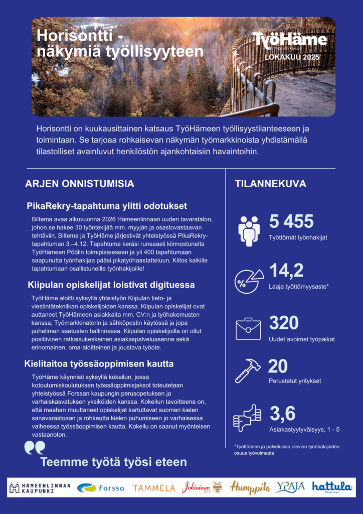 Horisontti on TyöHämeen kuukausittainen katsaus, joka avaa yleistajuisesti näkymiä alueen työmarkkinoihin sekä niiden tämänhetkisiin ilmiöihin. Julkaisu yhdistää tilastolliset avainluvut ja henkilöstön kenttähavainnot, tarjoten tiiviin, mutta monipuolisen tilannekuvan työllisyyden kehityksestä ja ajankohtaisista ilmiöistä TyöHämeen työllisyysalueella.